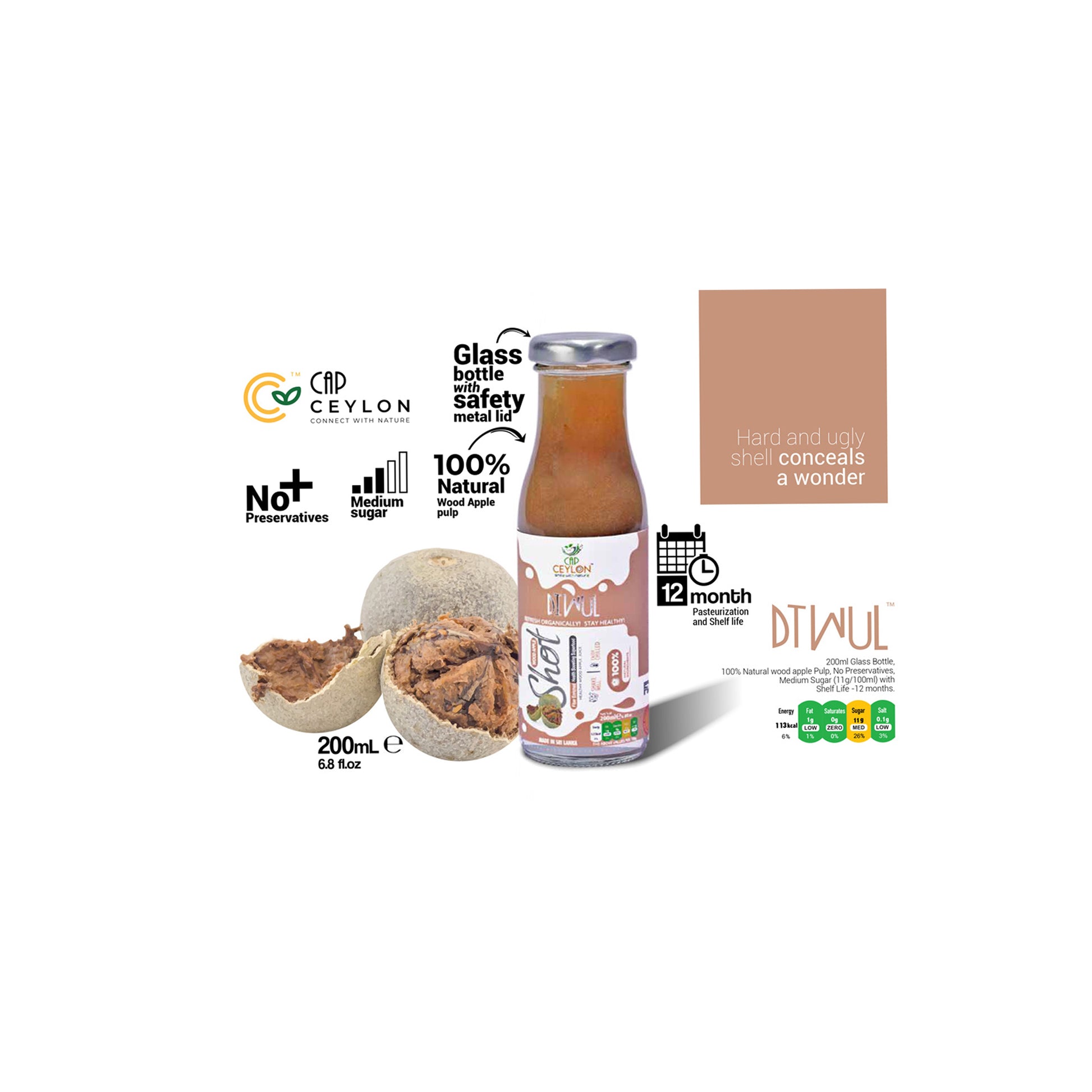 CAP Ceylon Wood Apple Shot (200 ml) es una bebida tropical saludable hecha de pulpa de manzana de madera 100% natural, cuidadosamente envasada en una botella de vidrio con una tapa metálica de seguridad. Con un contenido medio de azúcar para una dulzura equilibrada y sin ningún tipo de conservantes añadidos, esta nutritiva bebida está pasteurizada para garantizar una vida útil de 12 meses y, al mismo tiempo, conservar su sabor auténtico. Rico en bondades naturales, el chupito de manzana CAP Ceylon Wood ofrece un sabor ácido único y un toque refrescante, lo que lo convierte en la elección perfecta para las personas preocupadas por su salud que buscan sabor y