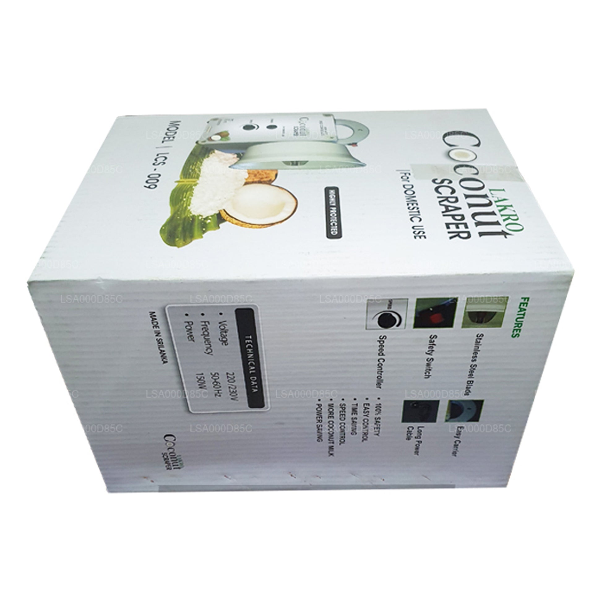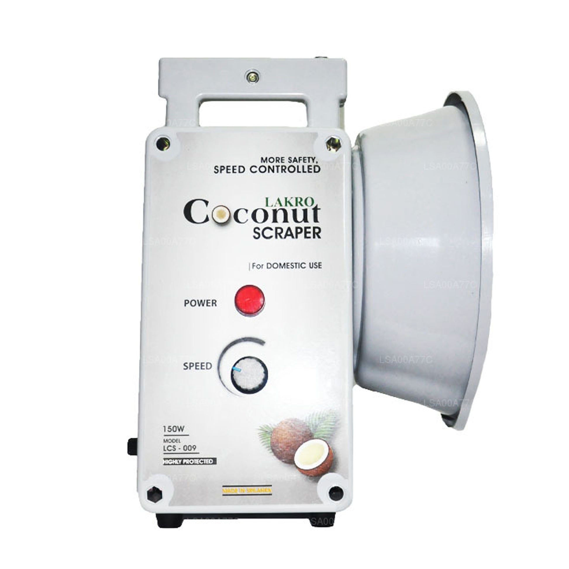 (SKU: LSA000D85C) Una trituradora o raspador de coco ideal para uso doméstico y fabricada completamente en Sri Lanka, lo que la hace auténtica y práctica. La máquina tiene la potencia de procesar un coco por minuto, lo que es perfecto para los hogares que siempre tienen prisa por cocinar. El raspador de coco eléctrico doméstico Lakro consta de un controlador de velocidad, un interruptor de control de seguridad y un indicador de alimentación. Debes asegurarte de mantener la máquina sobre una superficie plana y firme, mientras que debes empezar a raspar el coco de la zona exterior y dirigirte gradualmente hacia el centro