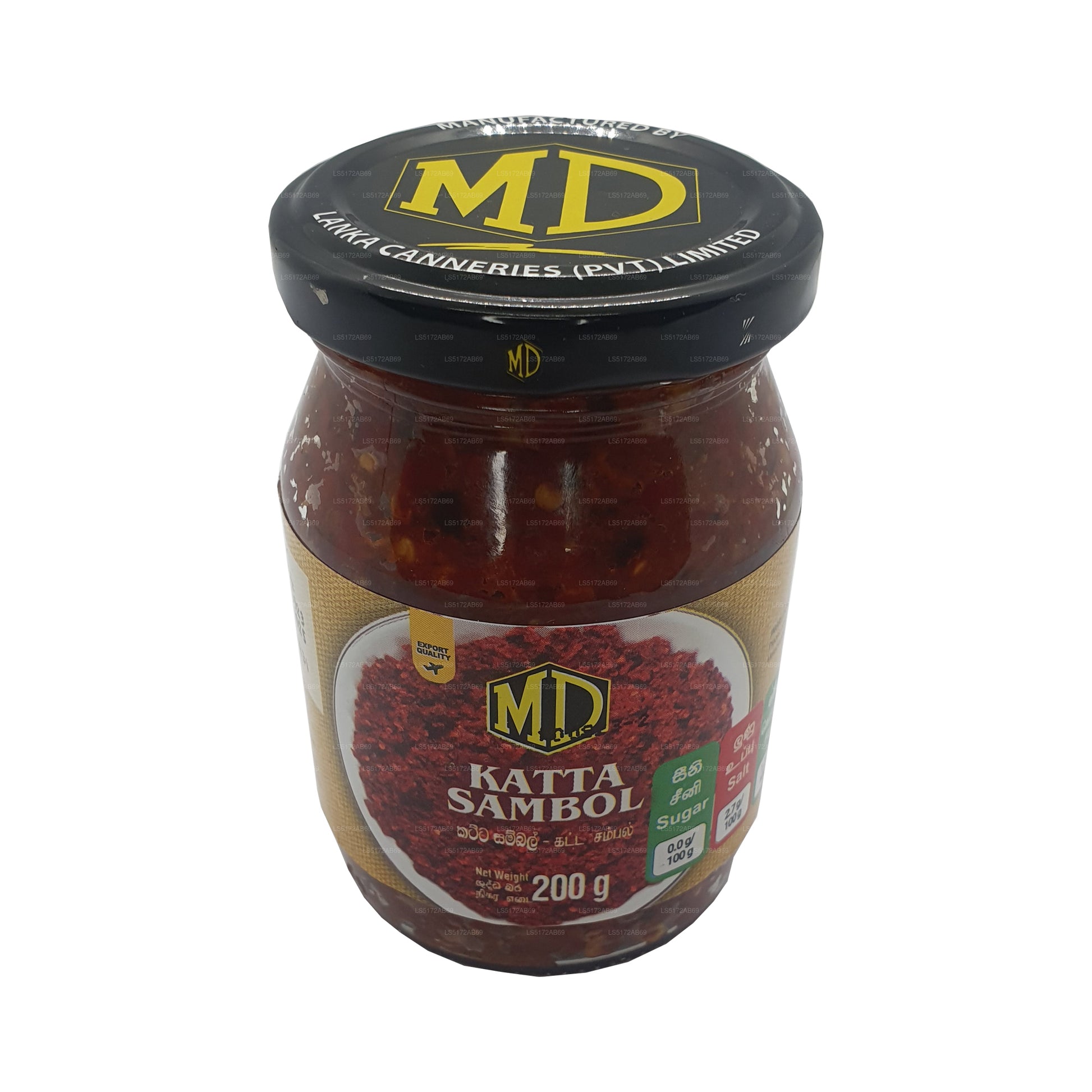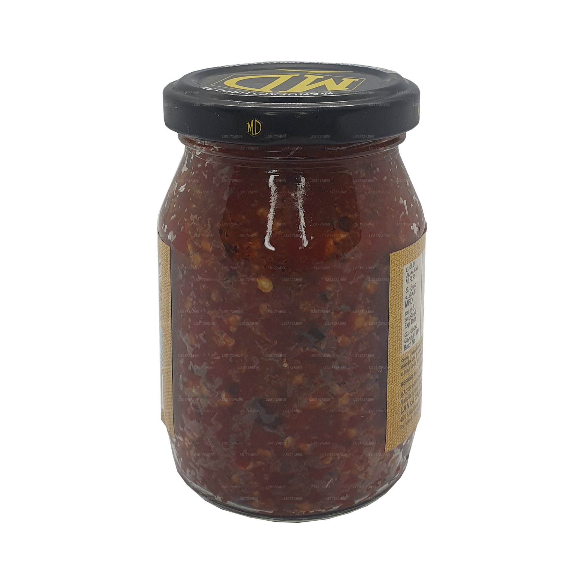 (SKU: LS5172AB69) Sambol MD Katta hecho con pulpa de cebolla morada, patatas fritas de pescado de Maldivas, trozos de guindilla, sal, jugo de lima y un conservante permitido metabisulfito de sodio (E 223)