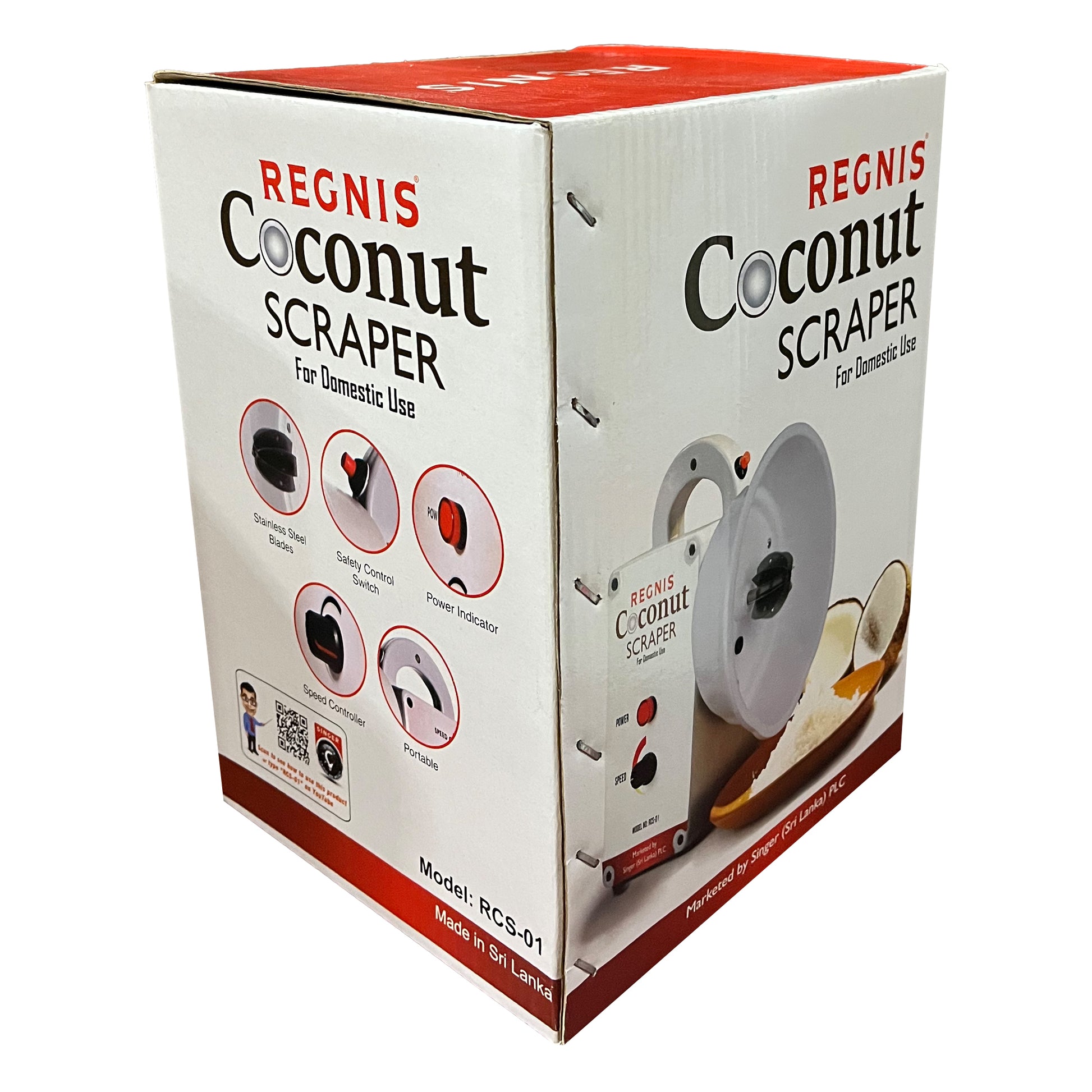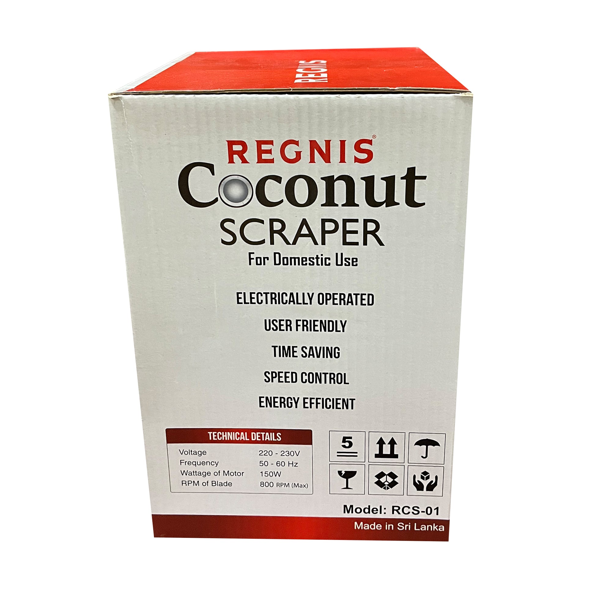 Regnis Domestic Electric Coconut Scraper (Model RCS-01) is a reliable and authentic coconut shredder, perfect for domestic use. Completely made in Sri Lanka, it offers excellent performance and convenience. With the ability to process one coconut per minute, this scraper is ideal for households looking to quickly prepare fresh coconut for cooking. The Regnis electric scraper comes equipped with a speed controller, safety control switch, and power indicator, ensuring smooth and safe operation.