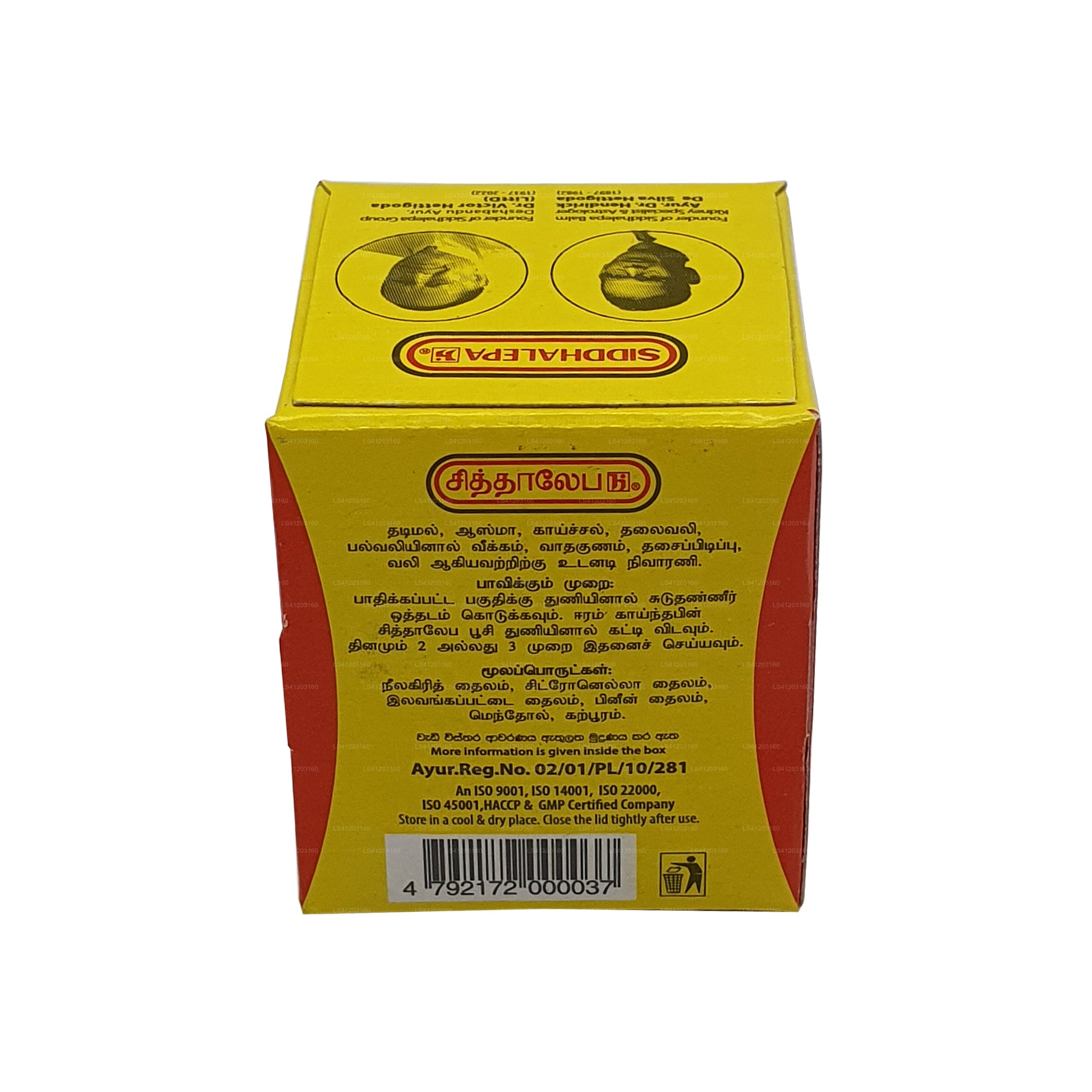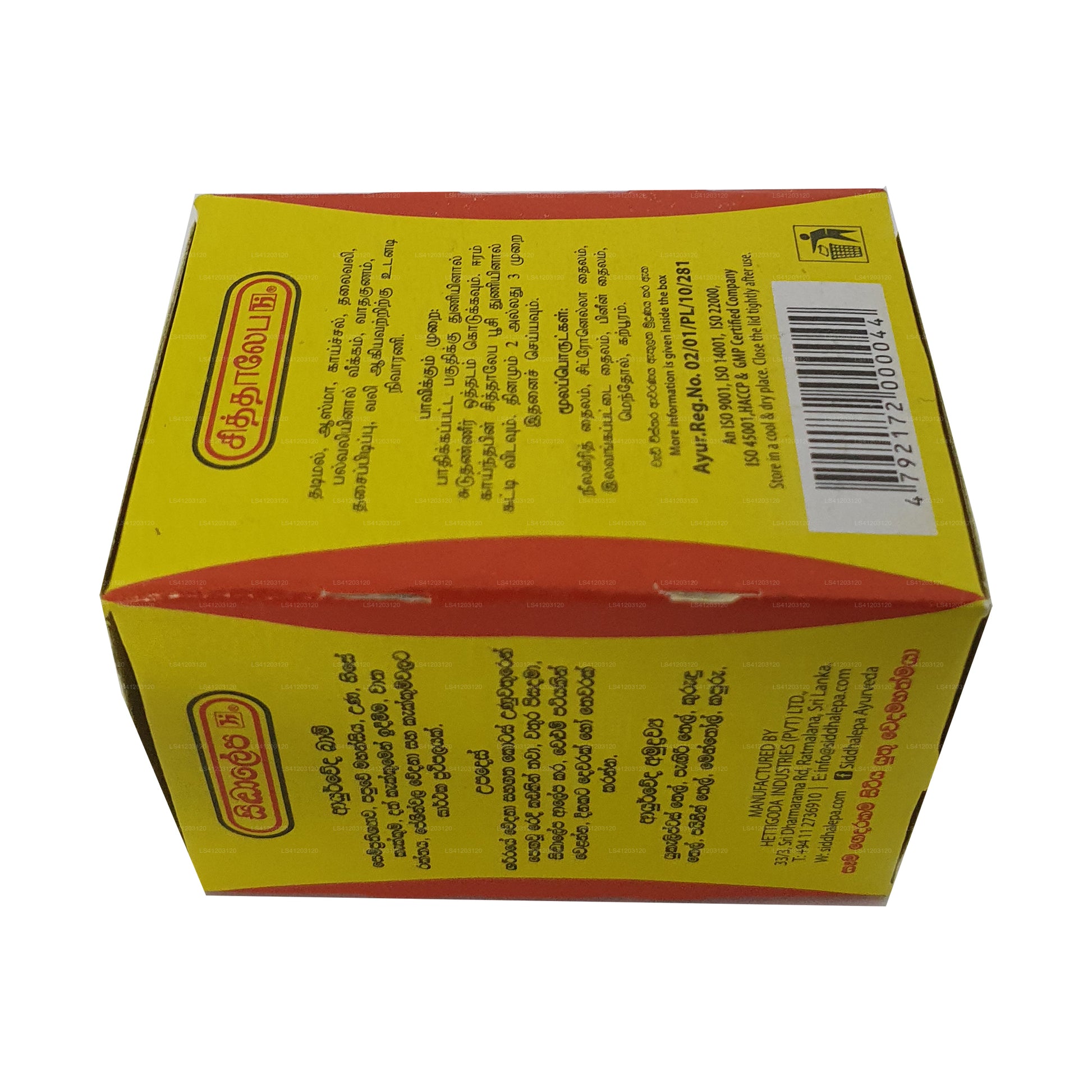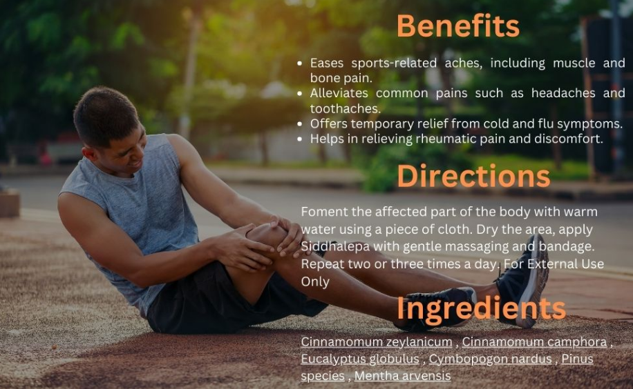 Modo de uso: Caliente la parte afectada del cuerpo con un paño humedecido en agua tibia. Seque el área, aplique Siddhalepa con un suave masaje y cubra con una venda. Repita dos o tres veces al día. Solo para uso externo.