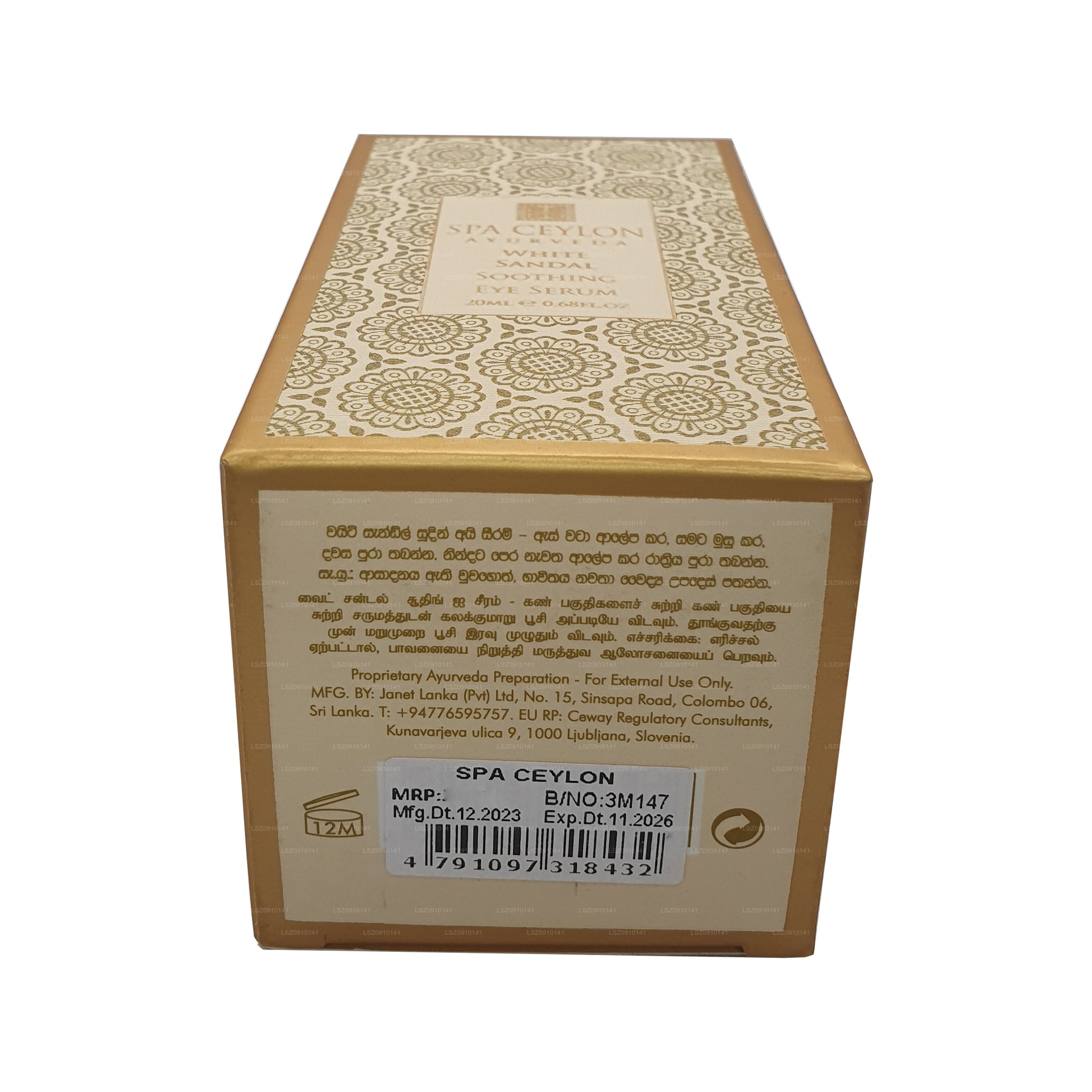 (SKU: LSZ0910141) The "Spa Ceylon White Sandal Soothing Eye Serum" is a 20ml skincare product specifically designed for the delicate eye area. Formulated with white sandalwood extracts, this serum aims to soothe and hydrate the skin around the eyes, reducing the appearance of puffiness, fine lines, and dark circles. With its lightweight and fast-absorbing formula, the Spa Ceylon White Sandal Soothing Eye Serum provides instant relief and refreshment to tired eyes. It helps to improve skin elasticity and firmness, leaving the eye area looking brighter, smoother, and more youthful. Ideal for daily use, this serum offers a luxurious and rejuvenating treatment for the delicate eye area.